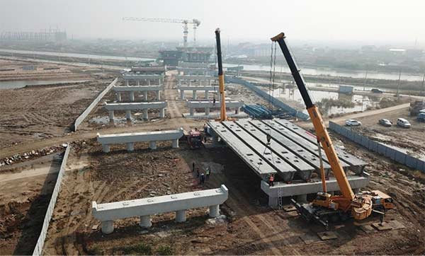 市重點工程濱響大道項目新進展!疏港航道大橋首跨預制箱梁架設完成