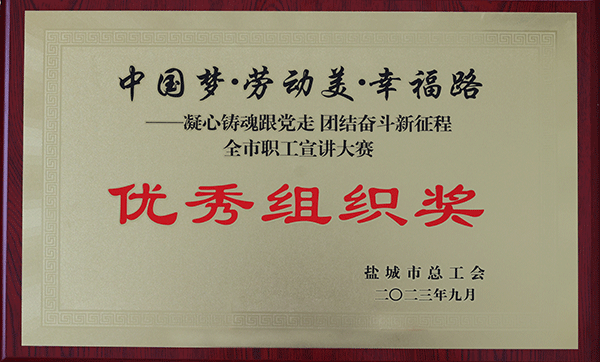 為深入學(xué)習(xí)貫徹習(xí)近平新時代中國特色社會主義思想和黨的二十大精神。市總工會開展了“強(qiáng)國復(fù)興有我”群眾性宣傳教育活動。9月20日,“中國夢·勞動美·幸福路——凝心鑄魂跟黨走 團(tuán)結(jié)奮斗新征程”全市職工宣講比賽決賽在射陽縣工人文化宮舉行,海興集團(tuán)獲“優(yōu)秀組織獎”,工會職工姜晏獲優(yōu)秀獎。2023-09-22 -