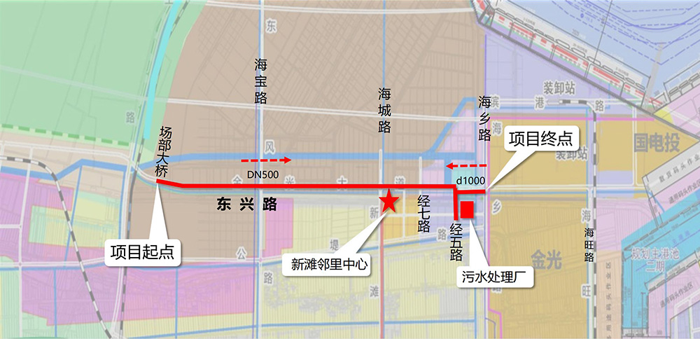 項目西起場部大橋,東至海鄉(xiāng)路,全長約7.4公里,總投資約3600萬元。其中,西段(場部大橋-經(jīng)五路)6.4公里為DN500壓力流管道,位于東興路北側(cè),負責轉(zhuǎn)輸污水處理廠以西范圍污水;東段(經(jīng)五路-海鄉(xiāng)路)1公里為d1000重力流管道,位于東興路南側(cè),負責轉(zhuǎn)輸污水處理廠以東范圍污水。近期先行實施經(jīng)七路至海鄉(xiāng)路段2.5公里污水管道,總投資約1500萬元。