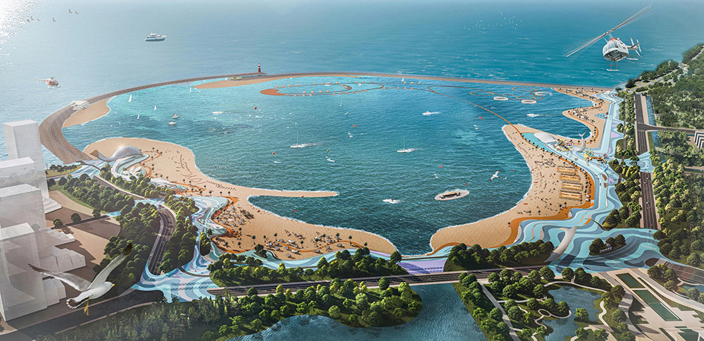 該項目位于月亮灣旅游度假區(qū)海堤外側(cè),以海濱文體旅游綜合體為定位,以2012年四條鯨魚擱淺新灘鹽場附近事件為引,結(jié)合古黃河文化和海洋文化,構(gòu)建以“鯨魚沙灘”為主題的IP。浴場主要功能為旅游、娛樂、度假、海洋科普教育、康體運動、專業(yè)賽事、遠洋觀光、節(jié)慶活動等,按照分區(qū)設(shè)計,項目整體設(shè)計分為四大主題和特色體驗區(qū),四大主題分別為“鯨舞”“鯨憩”“鯨游”“鯨躍”等主題板塊,十二個特色體驗區(qū)為抹香鯨主題中心、商業(yè)美食街區(qū)、露營基地、水上運動區(qū)、沙灘體育基地、主題水上樂園、海上舞臺、海上度假區(qū)、帆船中心、遠洋觀光區(qū)、浪漫藝術(shù)海岸、漂浮體驗區(qū)。
